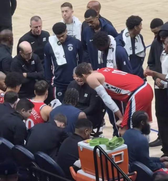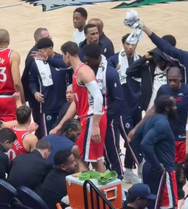 在一次暫停環(huán)節(jié),快船主帥泰倫盧在布置戰(zhàn)術(shù),坐在面前的球員是巴圖姆、桑德斯、博格丹、萊昂納德,一旁的大洛佩斯則低著頭認(rèn)真聽著,而其他球員則站在他的身后??烧材匪?哈登卻沒有上前,而是坐在一旁,安靜的坐著,沒有任何動作,直接冷眼旁觀。對泰倫盧的戰(zhàn)術(shù)安排完全不關(guān)注,似乎也是不太滿意。