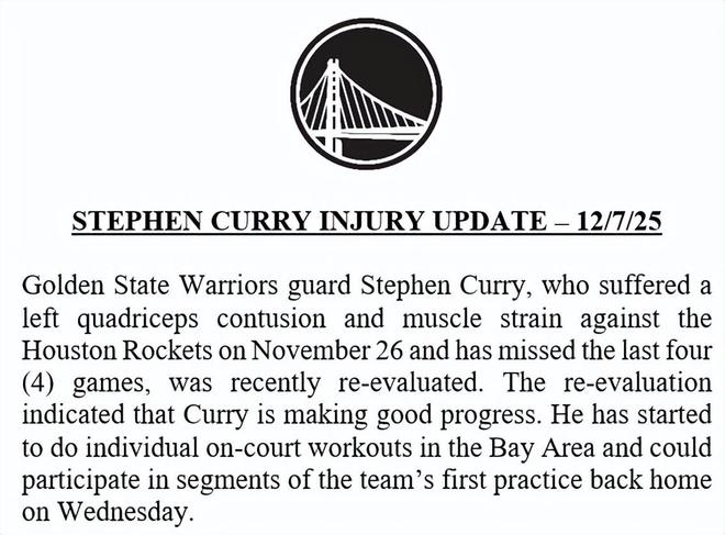 官方公告寫道:金州勇士后衛(wèi)斯蒂芬-庫里于11月27日(北京時間,下同)對陣休斯頓火箭的比賽中遭遇左股四頭肌挫傷及肌肉拉傷,此后已缺陣4場賽事。球隊近期對其傷情進行了復查,結(jié)果顯示庫里恢復情況良好。他已在灣區(qū)開啟個人場內(nèi)訓練,有望在周四球隊回到主場后的首堂訓練課中參與部分環(huán)節(jié)。