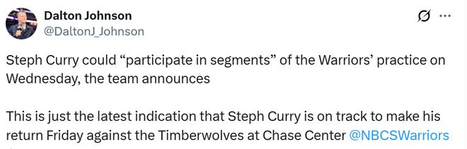 隊記Dalton Johnson轉(zhuǎn)發(fā)了勇士的公告,并表示這進一步表明庫里有望在本周六主場對森林狼的比賽中復出。