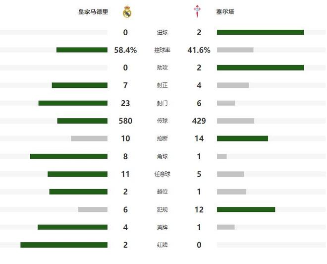 第65分鐘皇馬再遭打擊,加西亞短時間內(nèi)連續(xù)吃到兩張黃牌,被主裁判直接罰下,比分落后的銀河戰(zhàn)艦,又陷入到了少一人作戰(zhàn)的不利處境之中,第74分鐘姆巴佩接到隊友長傳后,獲得了扳平比分的絕佳機會,可惜挑射稍稍高出橫梁,比賽最后時刻,皇馬助教和卡雷拉斯也被罰下,最后時刻塞爾塔再入一球,將全場比分定格為了2-0。