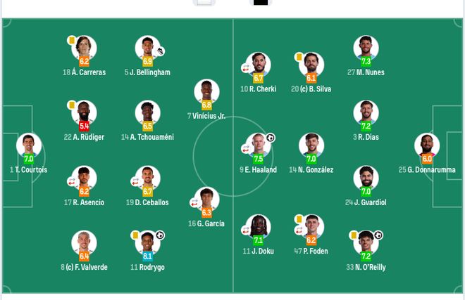 皇馬替補:13-盧寧、26-弗蘭·岡薩雷斯、9-恩德里克、10-姆巴佩、15-居萊爾、20-弗蘭·加西亞、21-迪亞斯、28-塞斯特羅、30-馬斯坦托諾、36-約安·馬丁內斯、40-巴爾德佩尼亞斯。